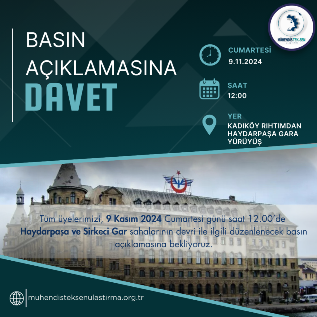 Tüm üyelerimizi, 9 Kasım 2024 Cumartesi günü saat 12.00’de Haydarpaşa ve Sirkeci Gar sahalarının devri ile ilgili düzenlenecek basın açıklamasına bekliyoruz.