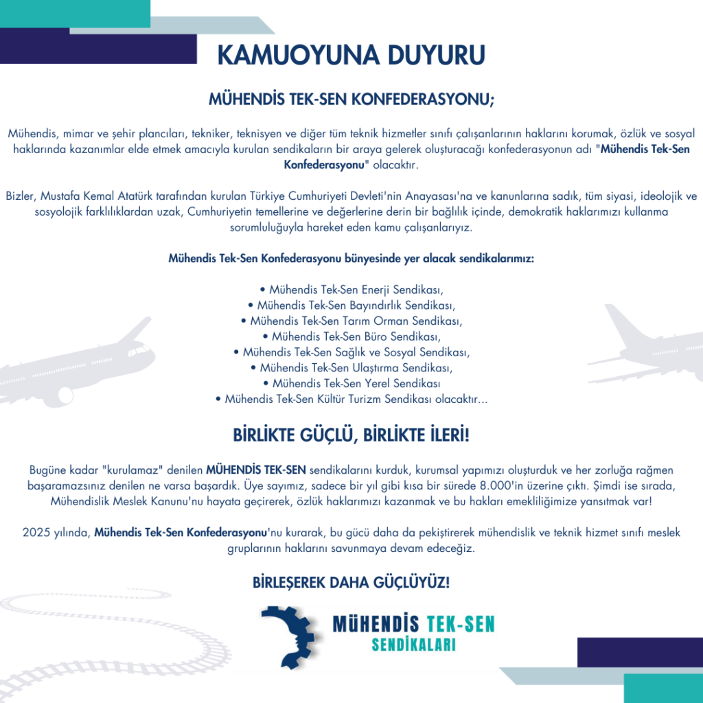 2025 yılında, Mühendis Tek-Sen Konfederasyonu’nu kurarak, bu gücü daha da pekiştirerek mühendislik ve teknik hizmet sınıfı meslek gruplarının haklarını savunmaya devam edeceğiz.